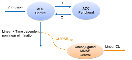 结合抗体FS-1502(ADC)和游离毒素MMAF一体化群体药动学建模示意图